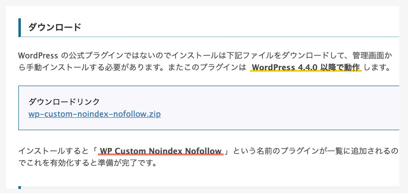 「WP Custom Noindex Nofollow」の解説ページにいってダウンロードしましょう。プラグインからの検索にはヒットしませんので、ダイレクトでプラグインのインストールを行ってください。