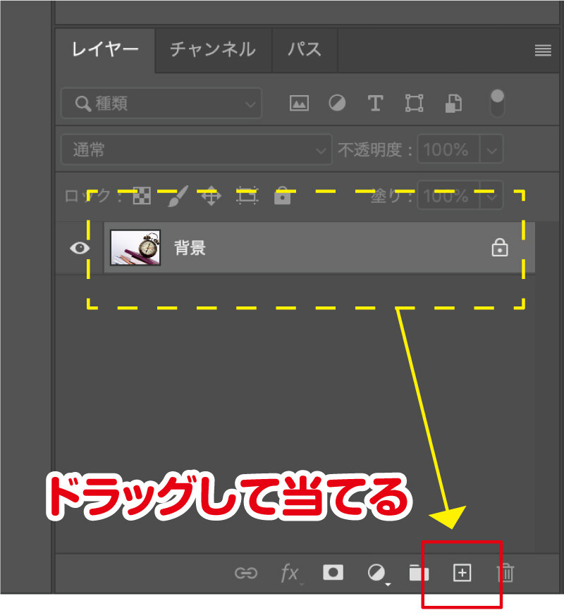 画像を開けたての時は、なぜかロックがかかっていますので、ロックを外してもいいのですが、レイヤーパネルのレイヤーをドラッグして、右下の( □+ )に当ててレイヤーを複製しましょう。