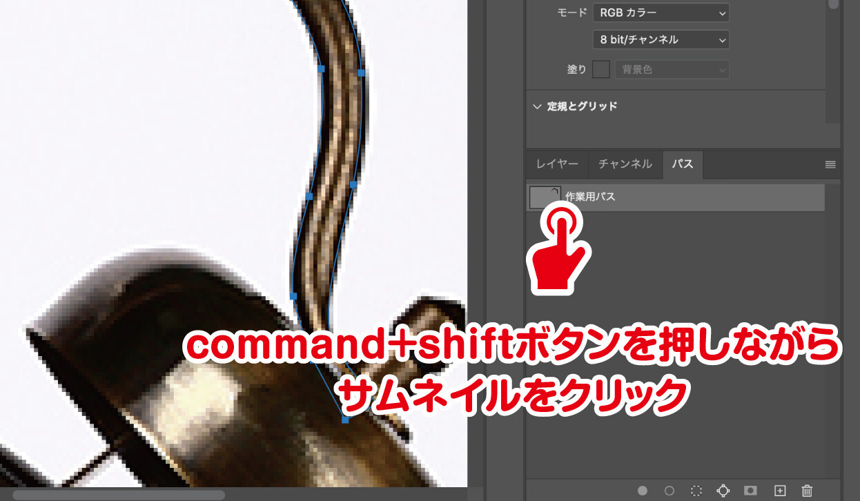 パスパネルにて、command+shiftを押しながらサムネイルをクリックしましょう。