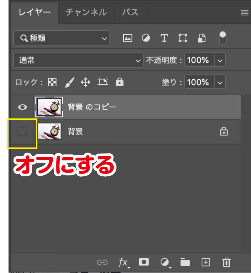 そして、「背景」と名前のついたレイヤーの目隠しボタンを押して、目隠ししましょう。