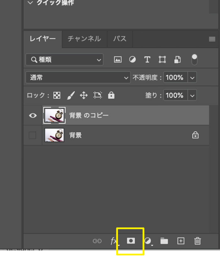 レイヤーパネルの左下にある「マスク」ボタンを押しましょう。