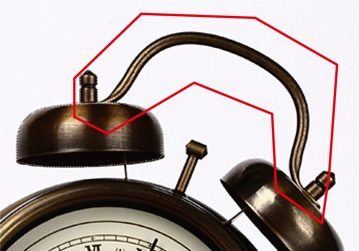 あとは、同様に多角形選択ツールで「ベル右」「ベルと時計を繋いでいる棒」「足部分」をShiftキーを押しながら作成し、時計部分はペンツールでパスから選択範囲を作っていきましょう。