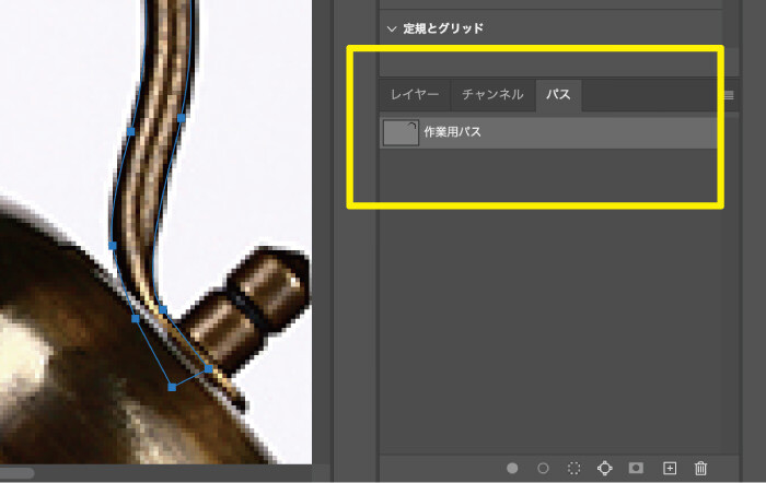 パス作成後、パスを閉じたら、レイヤーパネルからパスパネルに切り替えましょう。