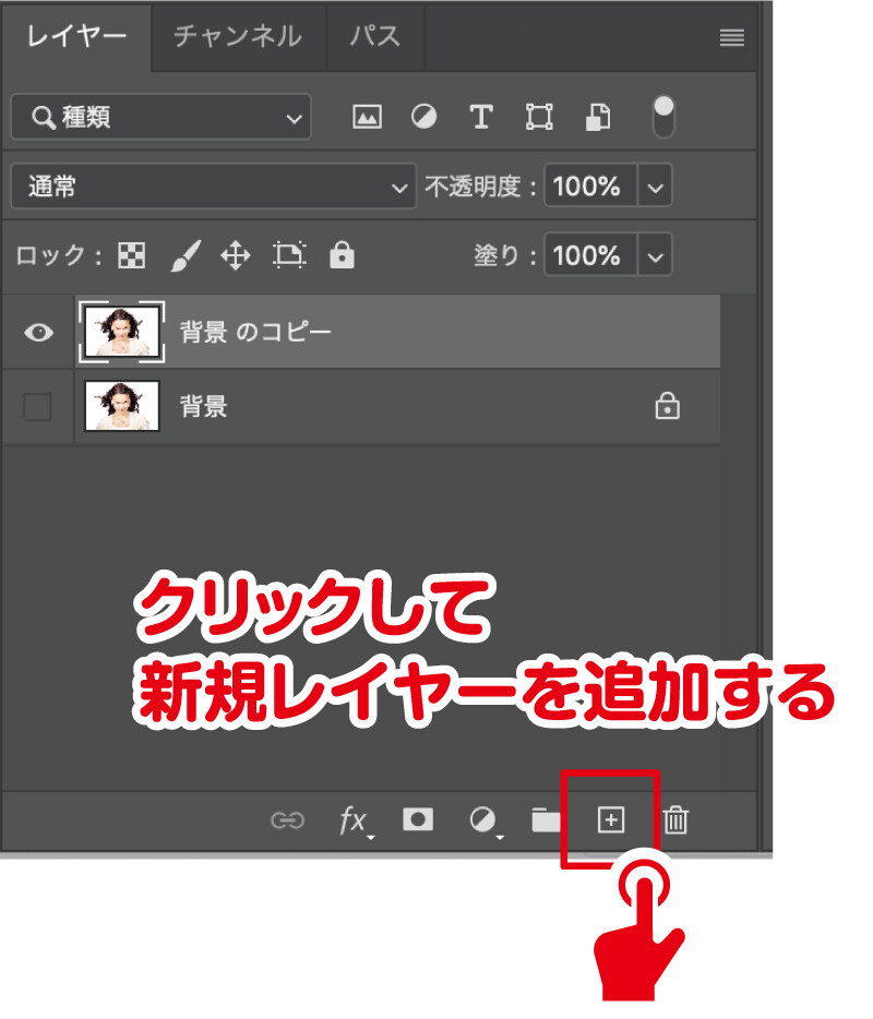 レイヤーパネルから右下の「□+」を押して、新規レイヤーを追加します。