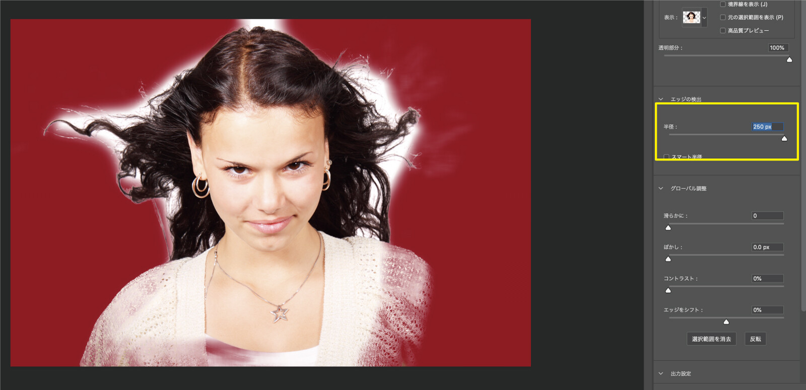 「エッジの検出」を最大値の250pxにしましょう。髪の毛がほぼ入り込んでいればOKです。