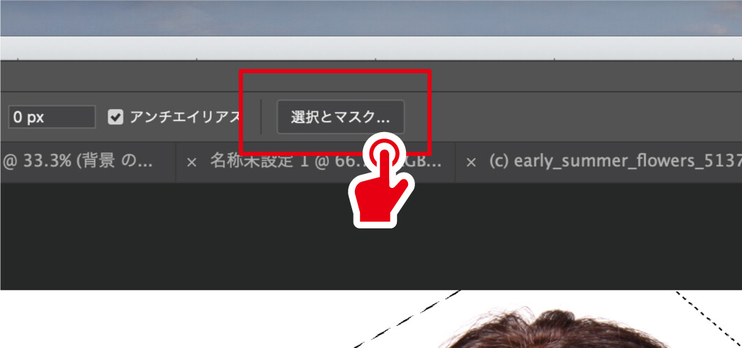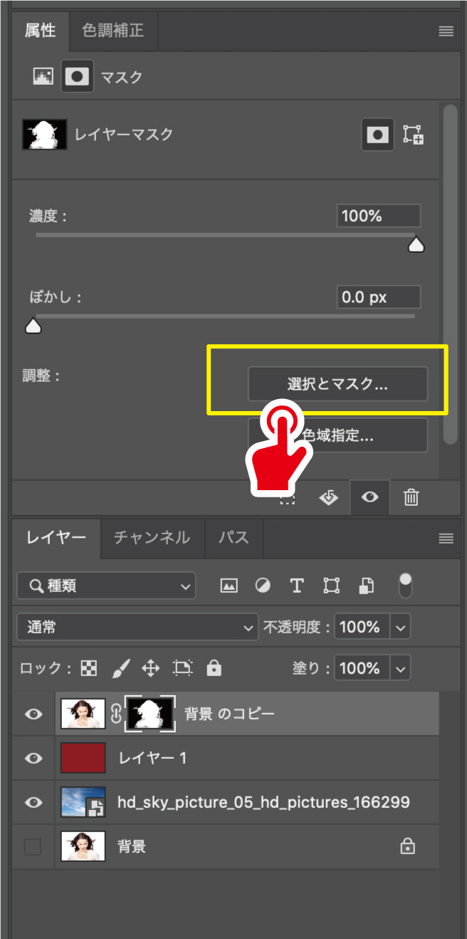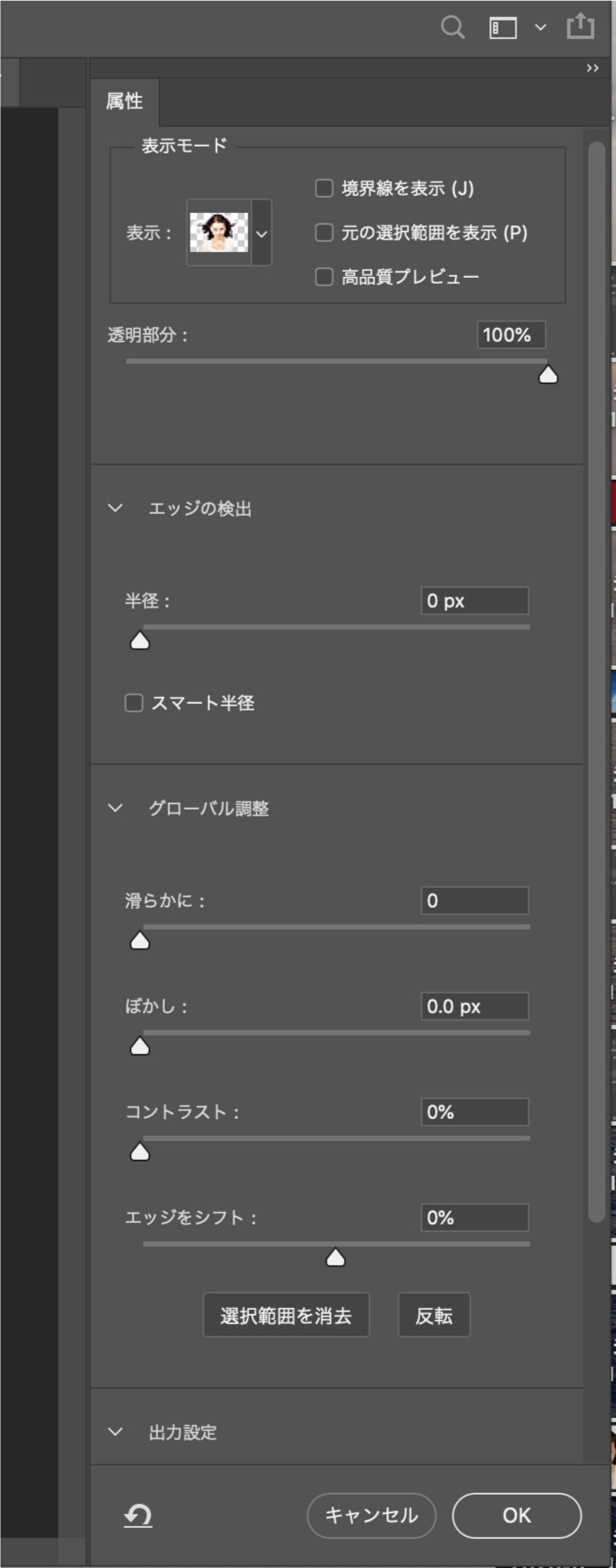 属性パネルにて、「選択とマスク」のボタンがありますので、それを押しましょう。