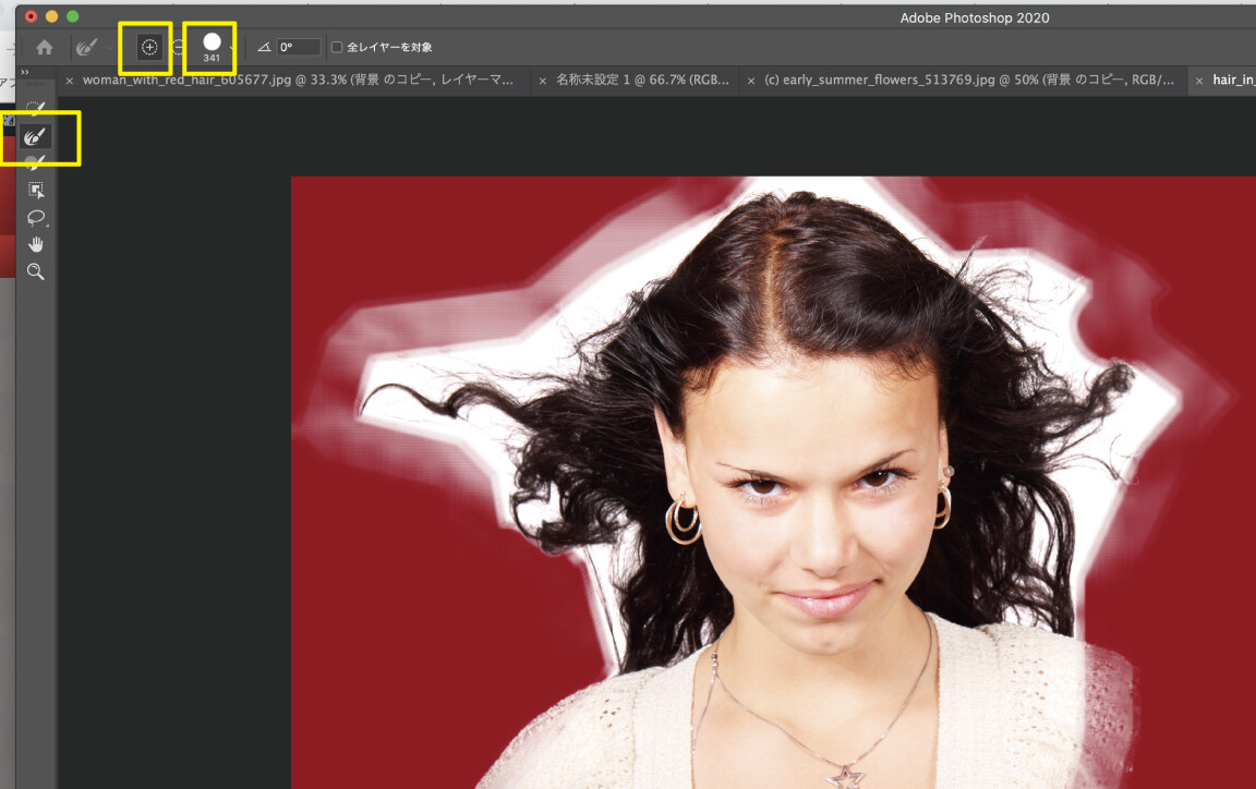 「背景のコピー」レイヤーを選択してから、髪の毛部分を大まかに選択していきましょう。