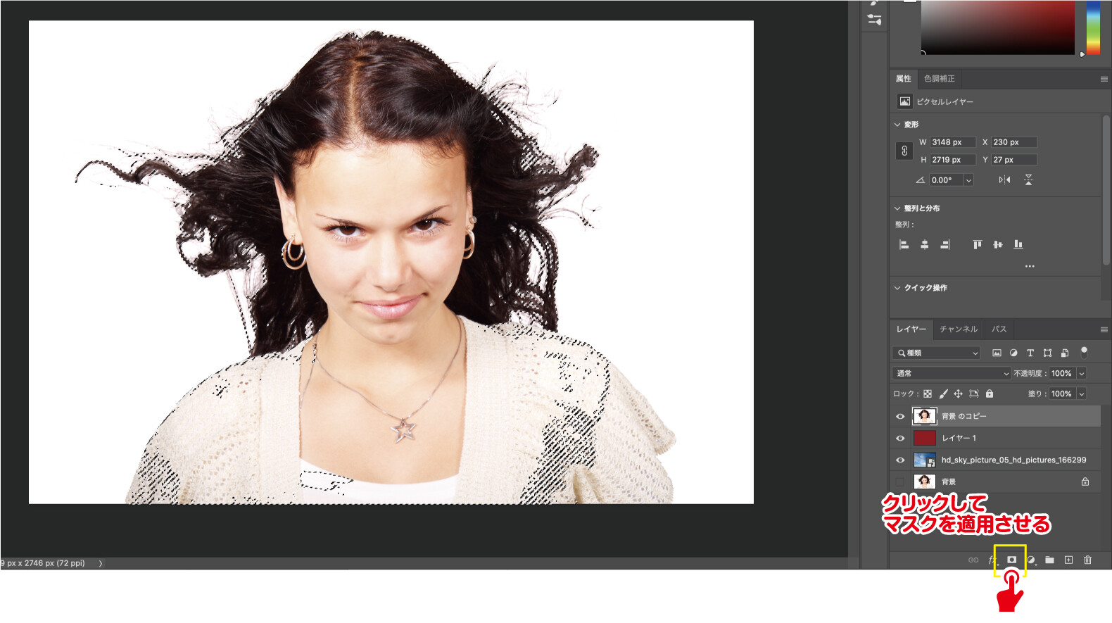すると、選択範囲が作られた状態で元の女性の画像が出てきますので、レイヤーパネルにて「マスク」を適用させましょう。