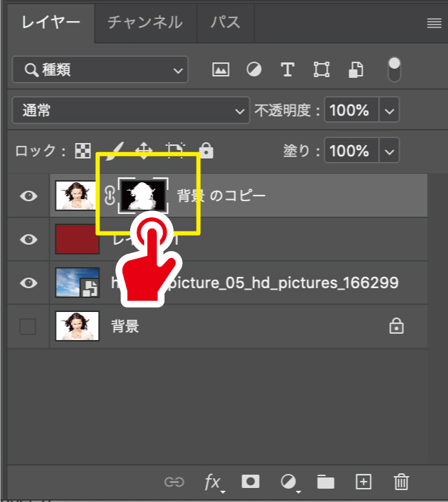 「背景のコピーレイヤー」の「黒に白抜き」になっているサムネイルをクリックして、マスクを選択します。