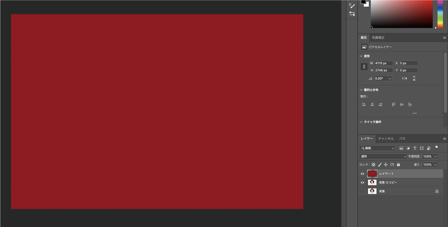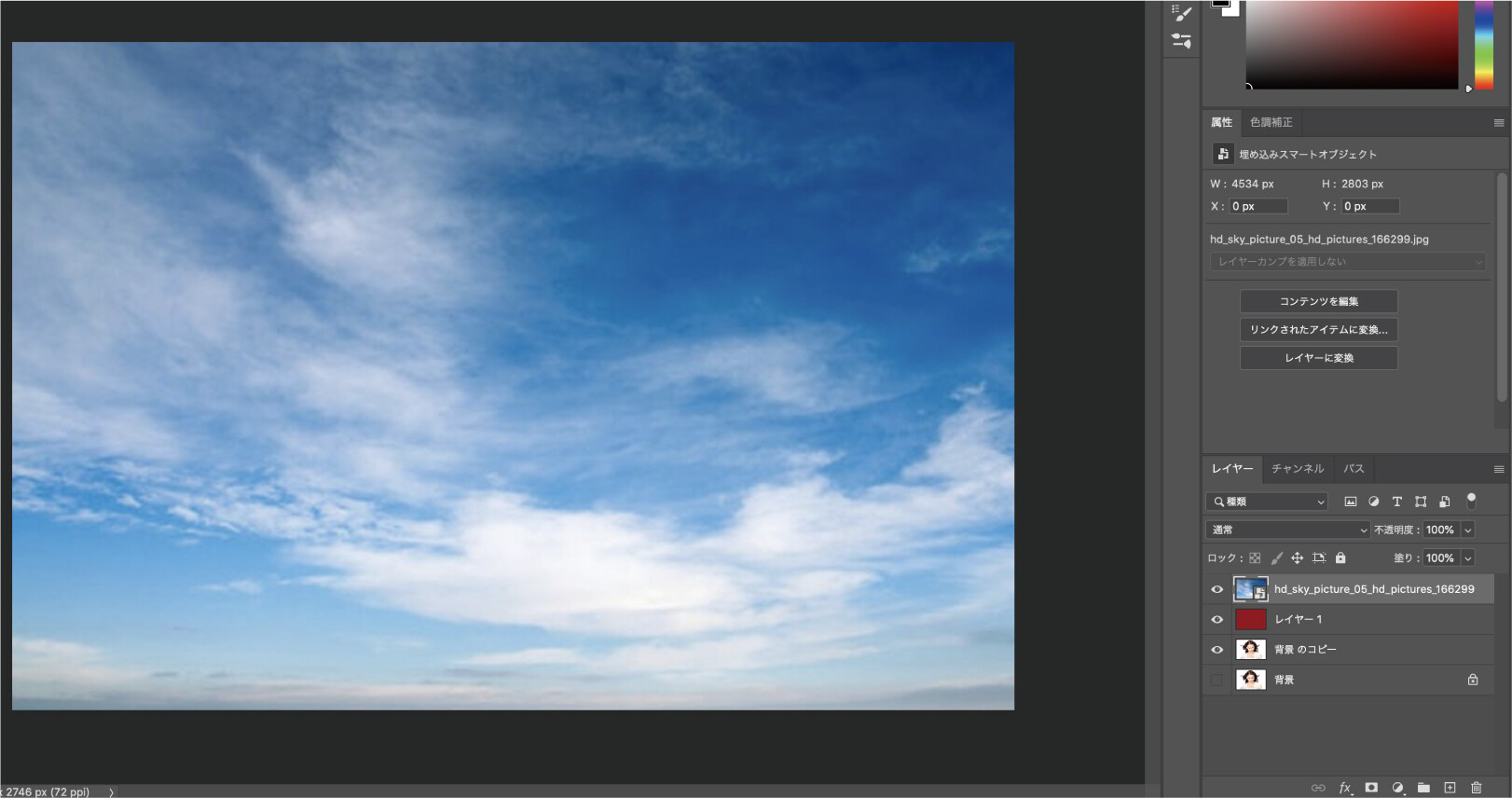 レイヤーパレットにて、ドラッグしてレイヤーの位置を変えてきます。一番上に「背景のコピー」、真ん中に「レイヤー1」の赤色画像、一番下に「空」レイヤーにしましょう。