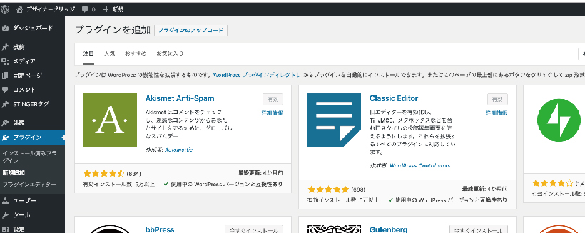 こちら上部の「新規追加」ボタンを押すことでプラグインを導入していくことが可能になります。