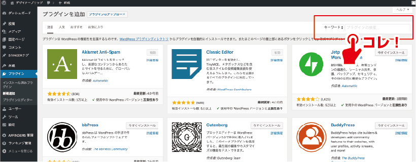 他に、上部タブボタンにて「人気」「おすすめ」などもあり、有名であったり、人気のあるプラグインが紹介されるのですが、この画面に目当てのものがない方が多いかと思いますので、画面右の「プラグイン検索」機能を使いましょう。