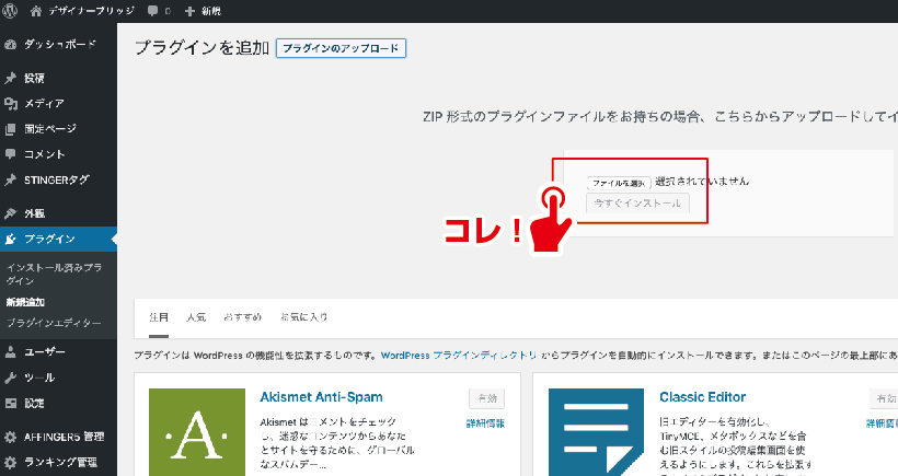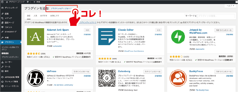 もうひとつのプラグインの導入方法ですが、事前にインターネットより目当てのプラグインをダウンロードしておき、それをアップロードするという方法があります。