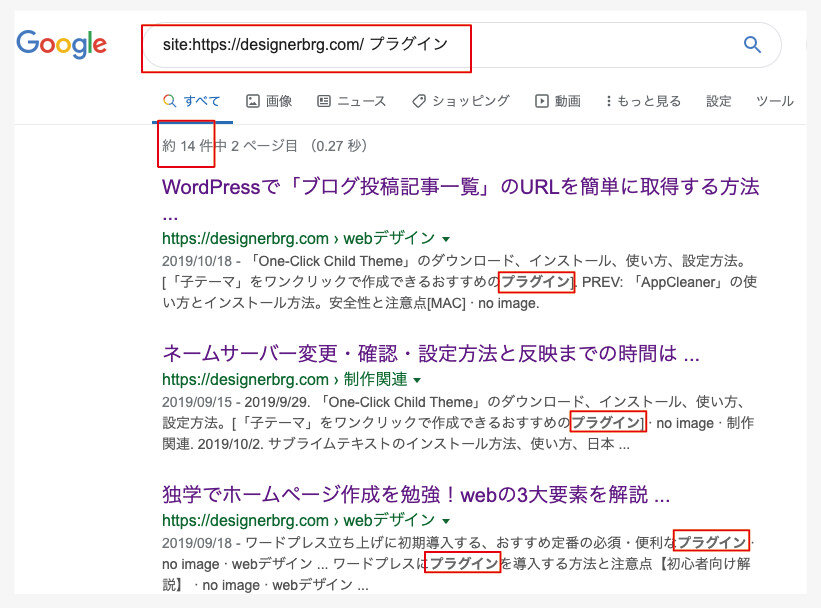 今回は「site:https://designerbrg.com/ プラグイン」で検索しましたので、すべてのページに「プラグイン」という言葉が含まれているのがわかりますね。全体の数も「14件」と減少しています。