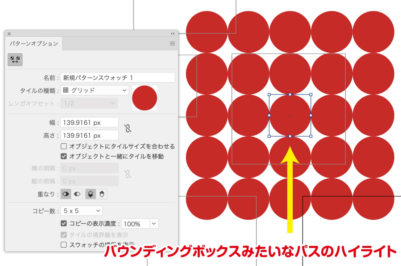 すると、元のオブジェクトにパス(バウンディングボックスのような感じ)が表示されるのがわかるでしょうか?これが、表示されている場合は、このパスを上下左右に引っ張る事で、「連続させる幅」などを直感的に操作していく事が可能です。