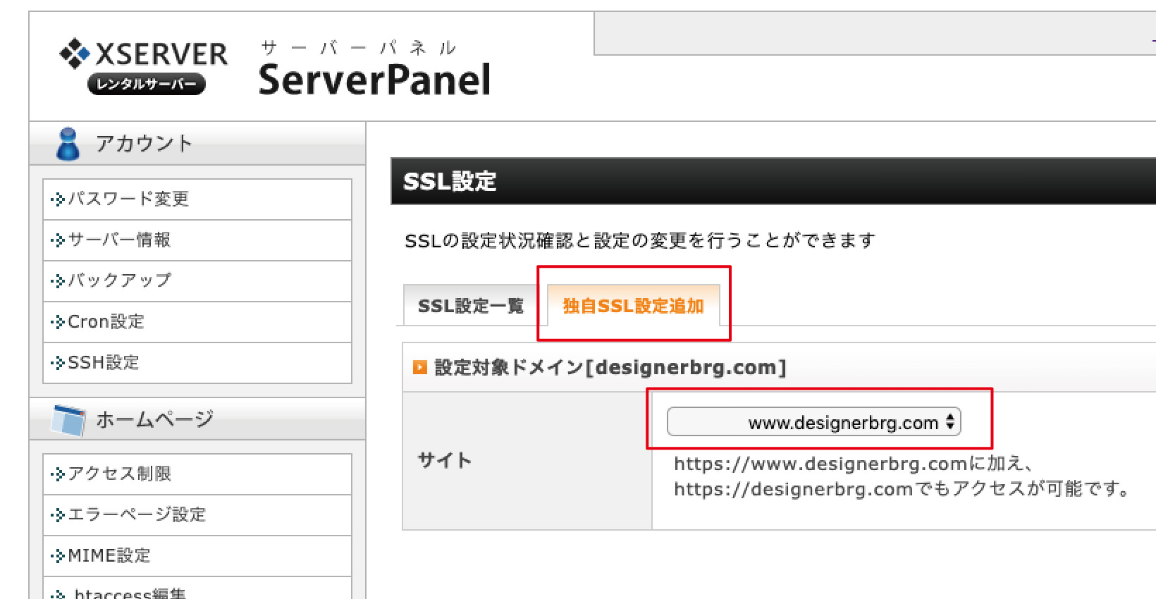 この時、当サイトでいうと、「https://designerbrg.com/」でも「https://designerbrg.com/」のどちらでもアクセス可能の状態になります。あくまでURLの違いだけですので、ページ内容はどちらも変わりませんので、その点留意ください。