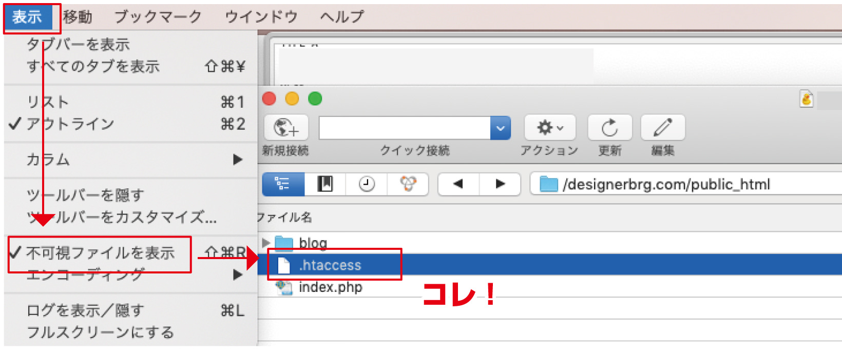 この段階では、「.htaccess」は見えていないので、上部メニューの「表示」から「不可視ファイルの表示」のチェックを押しましょう。
