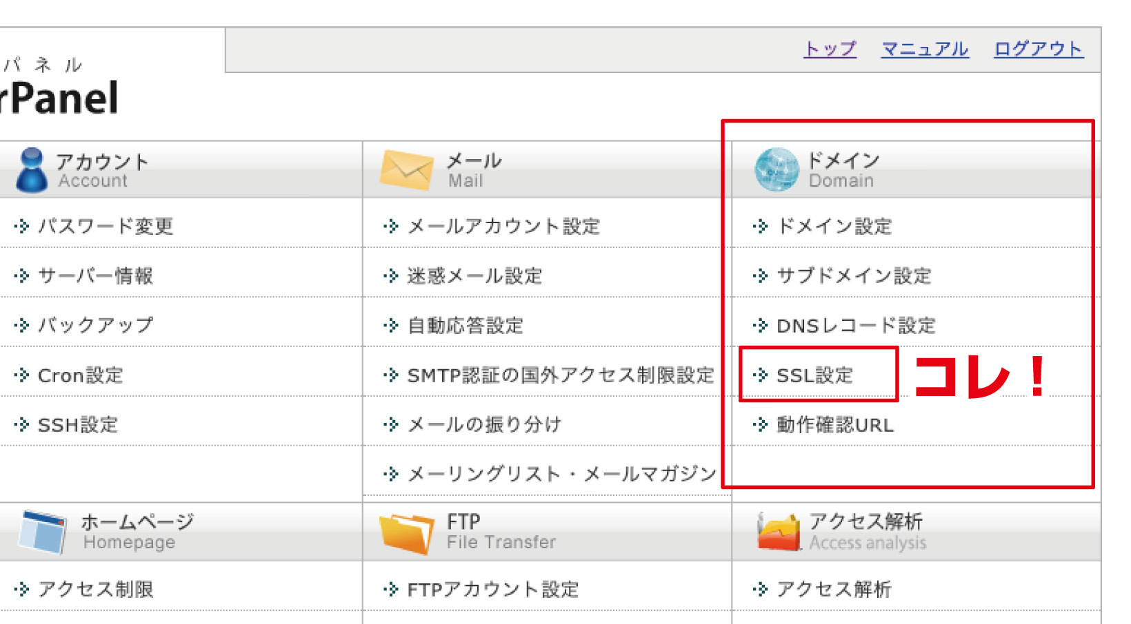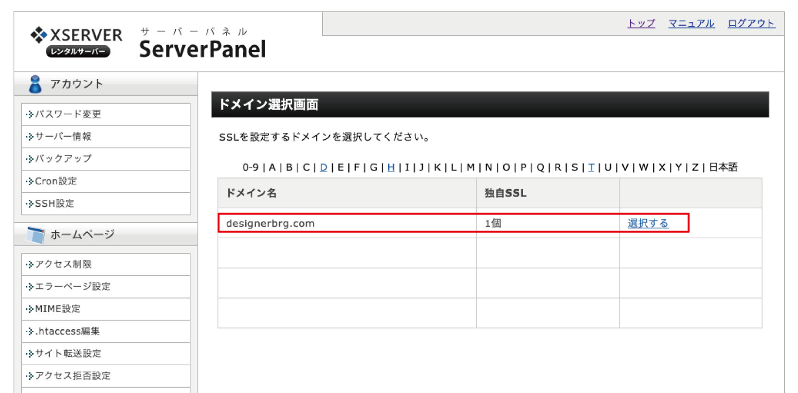 サーバー管理画面である、エックスサーバーのサーバーパネル(ワードプレスのダッシュボードではありませんよ!)に入って、「ドメイン」→「ドメインSSL設定」と進んでいきましょう。