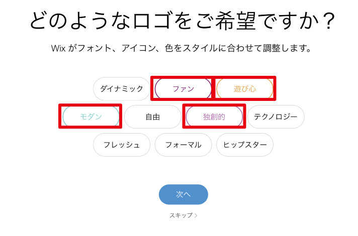 思い描くロゴのイメージを選びましょう。「ファン」「遊び心」「モダン」「独創的」を選びました。