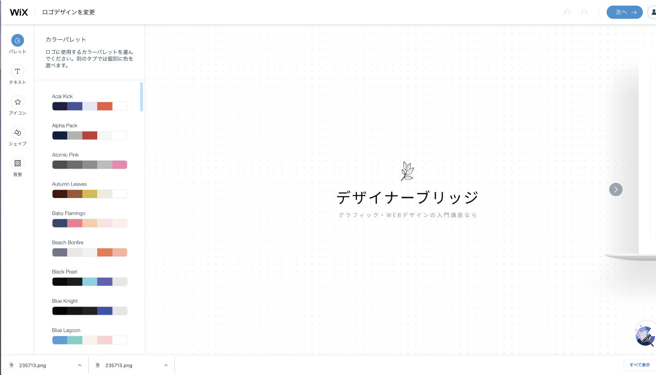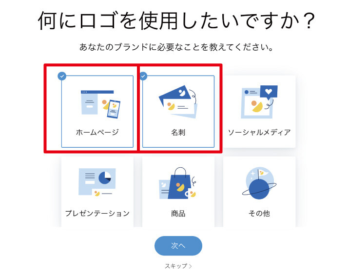 ここでは、「ホームページ」と「名刺」を選択しました。「次へ」を押して、しばらくするとロゴが制作されます。