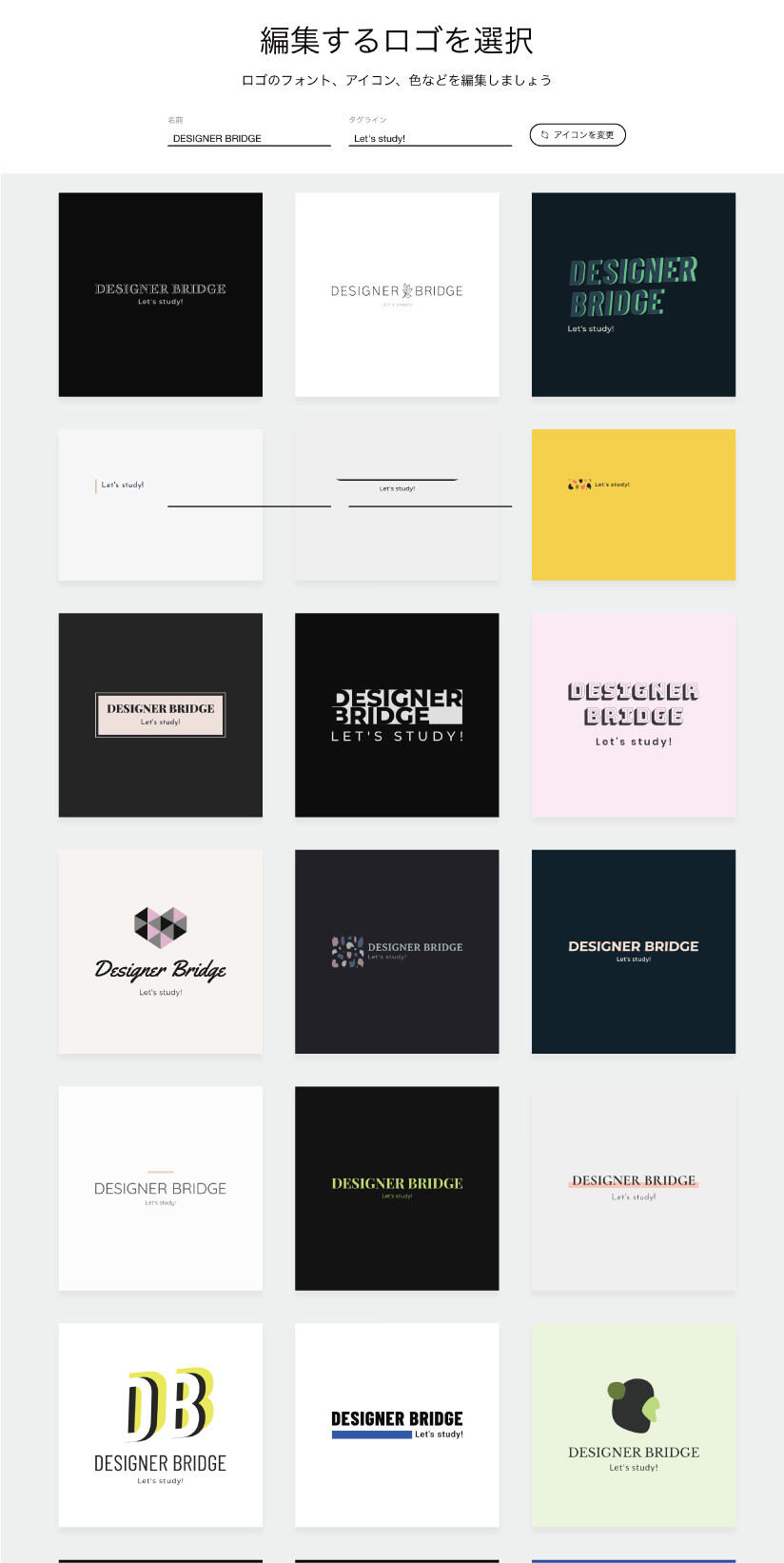 以下は、動画内のキャプチャーになりますが、文字を入れてイメージ画像を選択するだけで以下のようなロゴが複数制作されるとの事です。