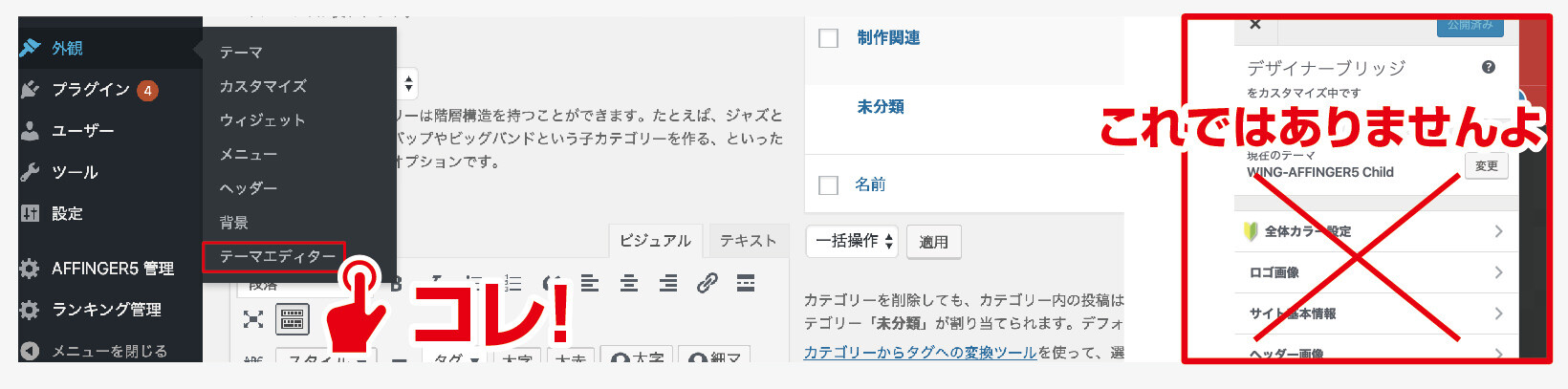テーマエディターを利用したカスタマイズでは、ホームページ制作の根本理解が弱く、学習成長速度も遅くなり、そもそもハンドリング自体も悪いと思っておりますので、テーマエディターでのカスタマイズはおすすめ致しません。