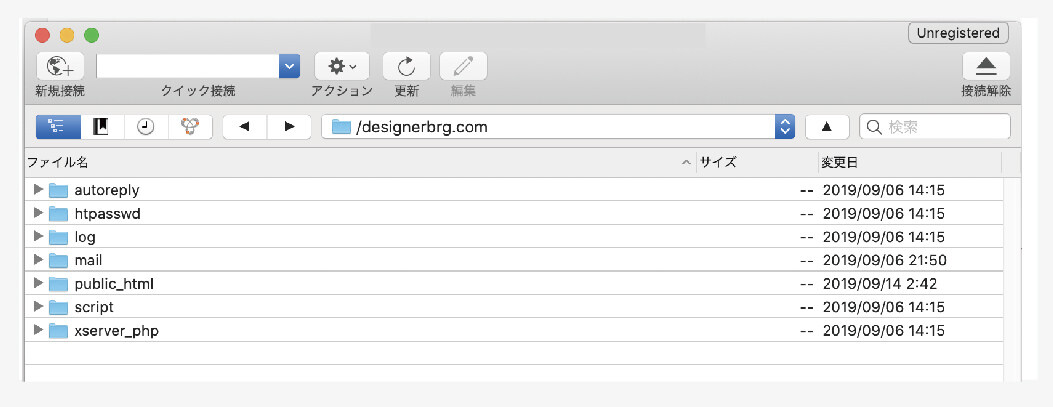 それでは、FTPクライアントソフトにて、該当ドメインにアクセスしましょう。アクセス方法がわからない方は以下の記事を参考にしてください。