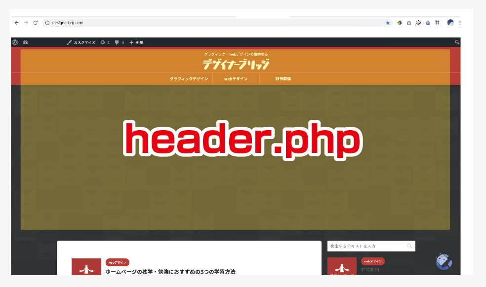 <head>タグと<header>タグのカスタマイズをしたい場合は、header.phpが該当ファイルになります。<body>の中にある、<header>の箇所も該当箇所になりますので覚えておきましょう。