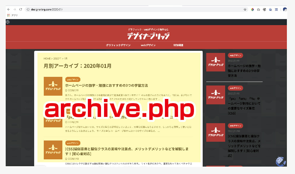 archive(アーカイブ).phpは「特定の記事一覧」に当たります。例えば、2020年1月に書いた記事一覧などありますよね。そのボタンを押すと一覧記事が出ていますので、そのページをカスタマイズしたい時の該当ファイルになります。