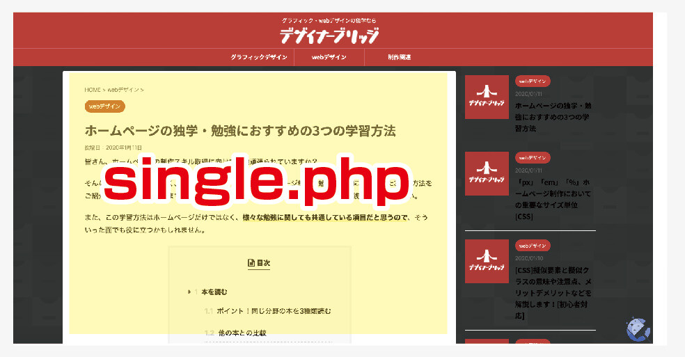 single.phpは、「共通の投稿ページ」の<main>エリアに当たります。記事の箇所ですね。