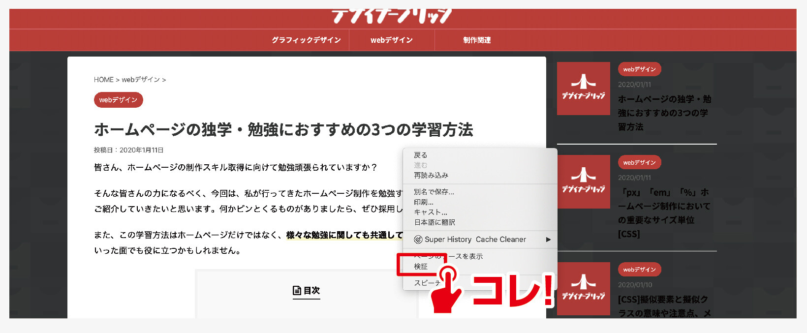 該当箇所の確認方法は、該当ページを開き、ブラウザにて「右クリック」→「検証」を押す事で開発専用ページが開かれますので、調べたい箇所をクリックして該当タグを把握しましょう。