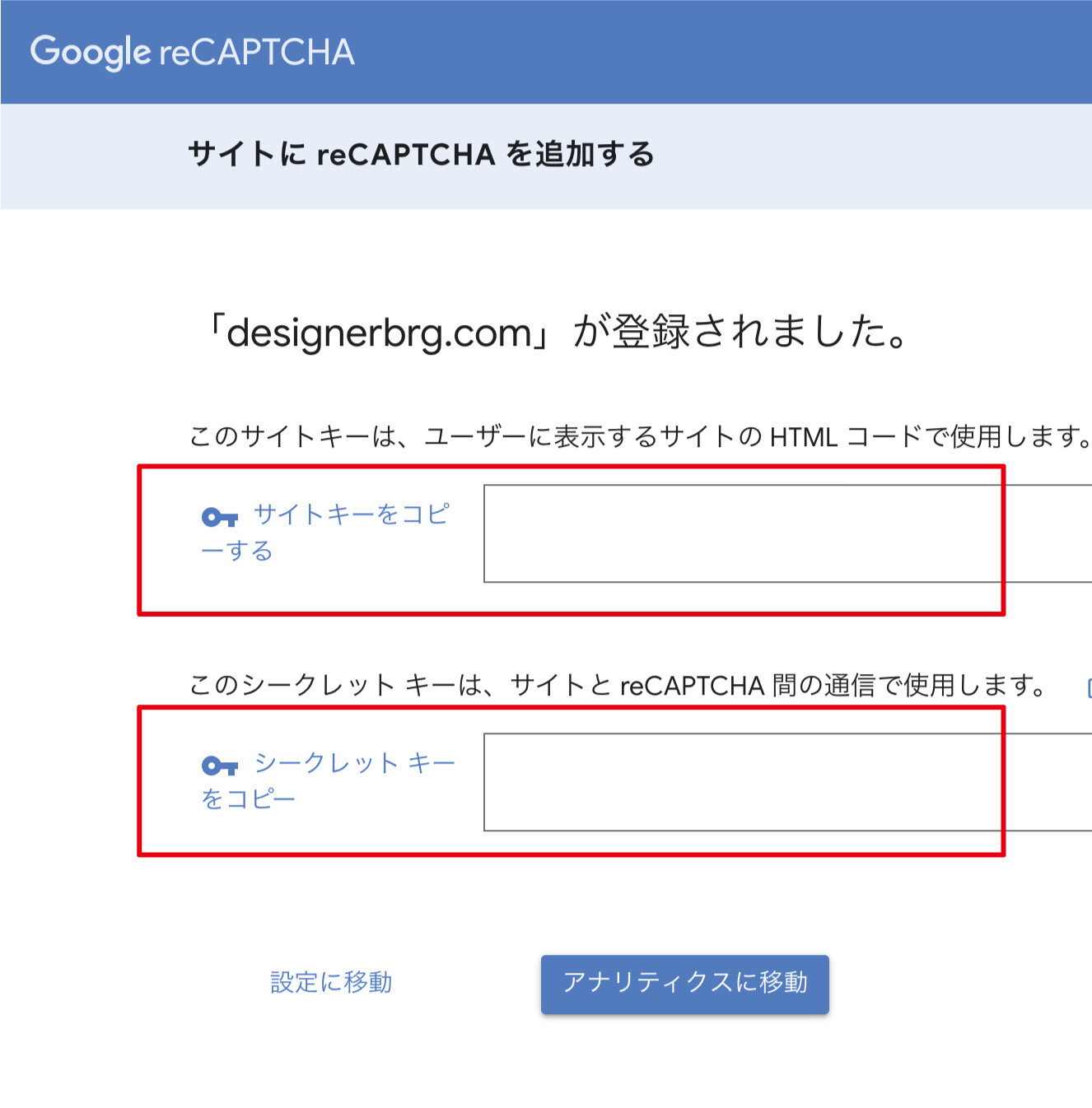 「サイトキー」と「シークレットキー」が発行されますので、メモ帳か何かに記録しておきましょう。